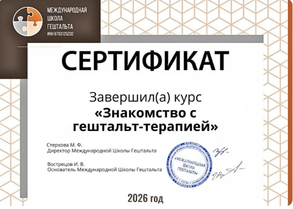 Вы получите официальный сертификат от Международной Школы Гештальта с печатью и подписью основателя - Ивана Вострецова